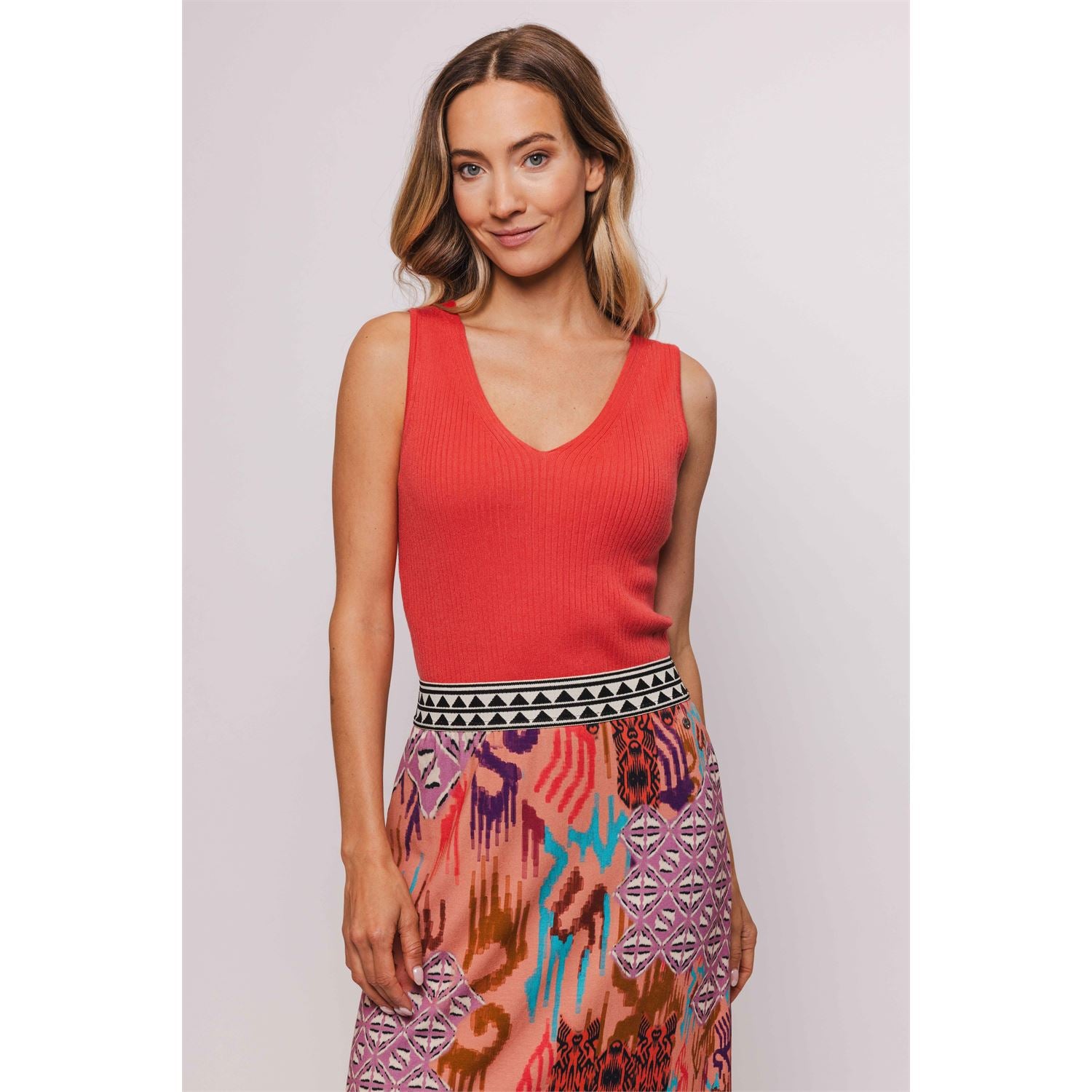 This nice basic top is made of a viscose mix rib knit. Tight fit with feminine V-neck.