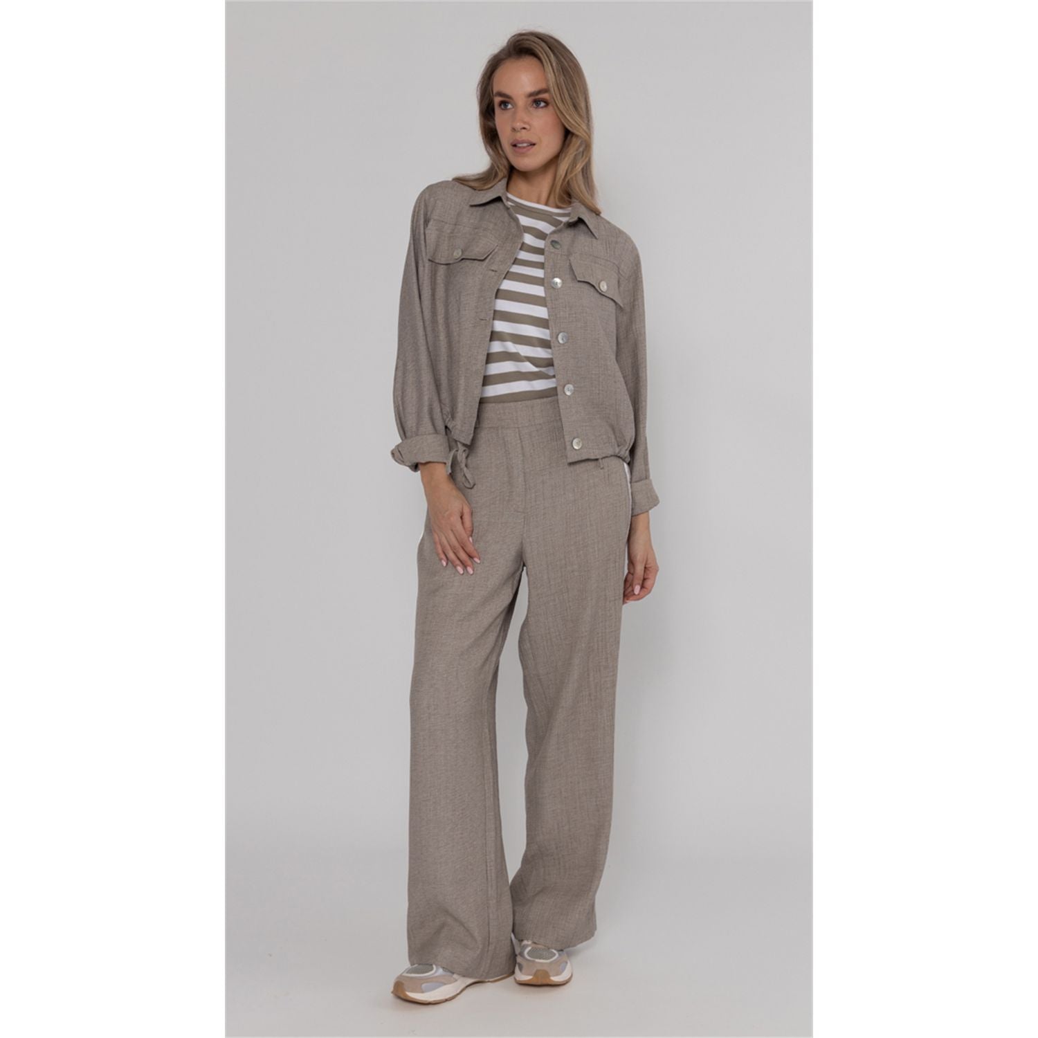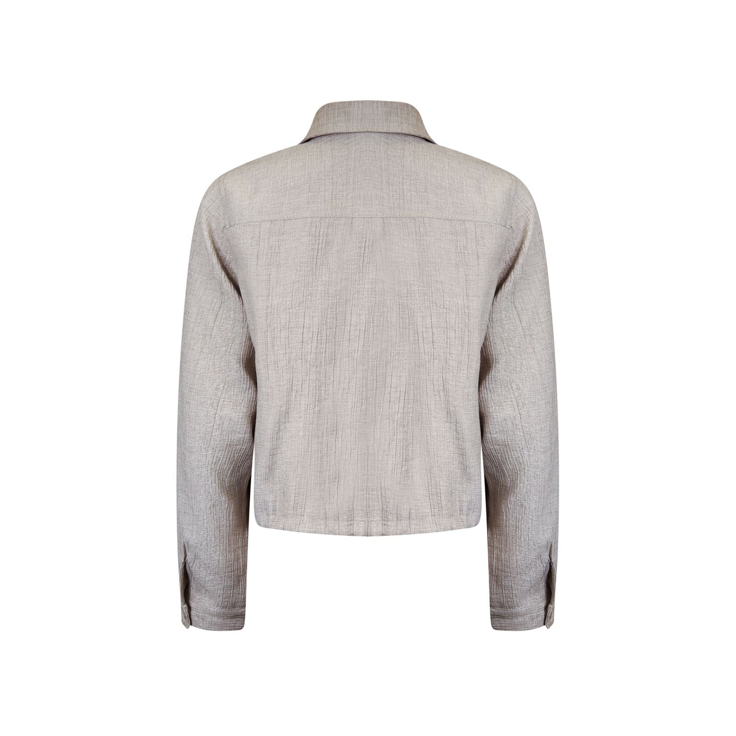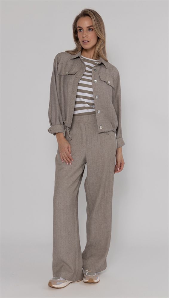 Jacket in melange green crinkle fabric with classic collar, button closure and flap pockets. Pair with the matching pants for a cool, layered look.