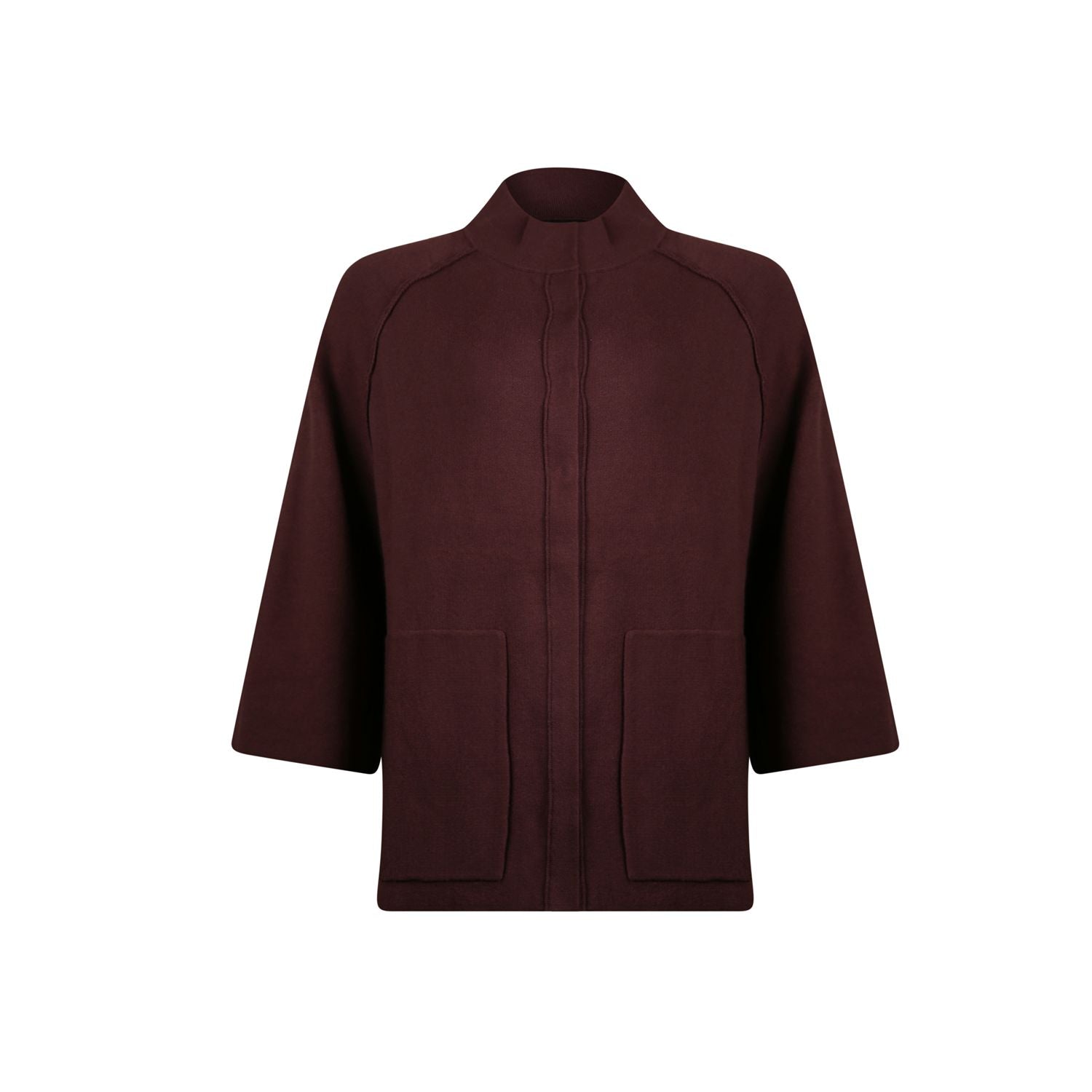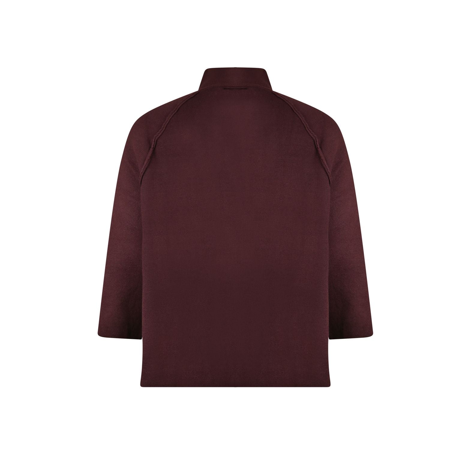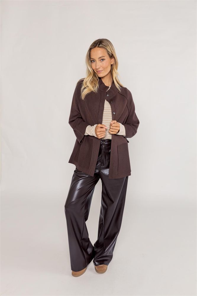 Halflang vest van viscosemix in milano steek. Wijde kimonomouw, opstaande kraag en drukknopen. Naar buiten gekeerde naden en opgestikte zakken geven een stoere, moderne look.