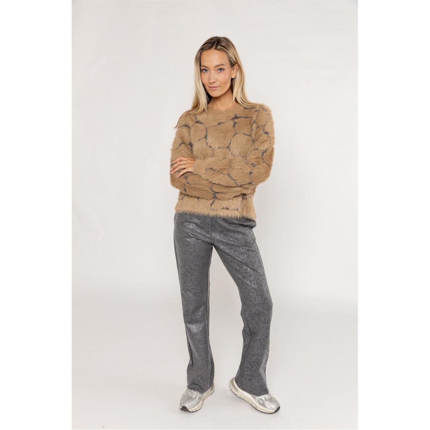 Stijl & comfort! Deze pull-on broek van stretchkwaliteit heeft een glanzende transparante print, normale taille met elastische band, flare pijpen en steekzakken. Een eigentijdse must-have.