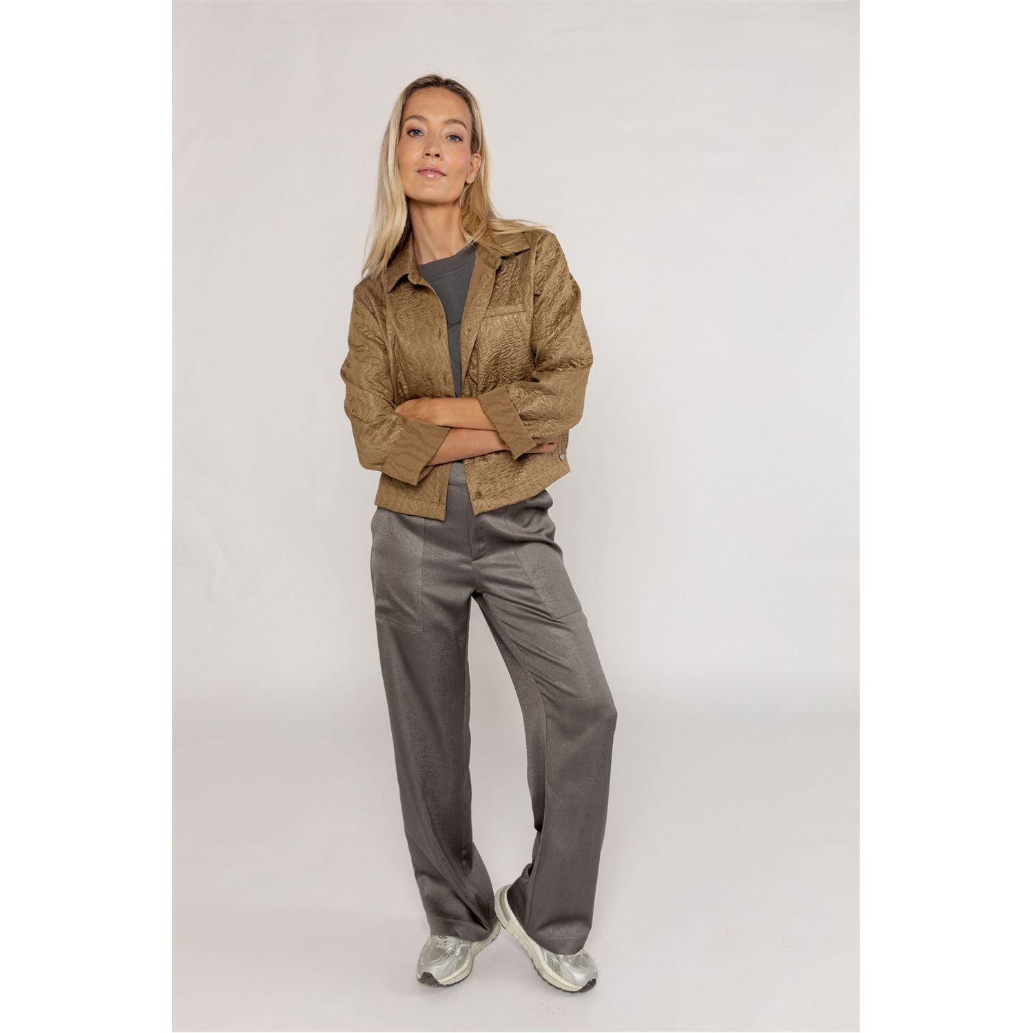 Satijnen broek met subtiel crinkle effect. Lange rechte pijpen, opgestikte steekzakken en knoopsluiting met rits. Stijlvol en comfortabel voor elke gelegenheid
