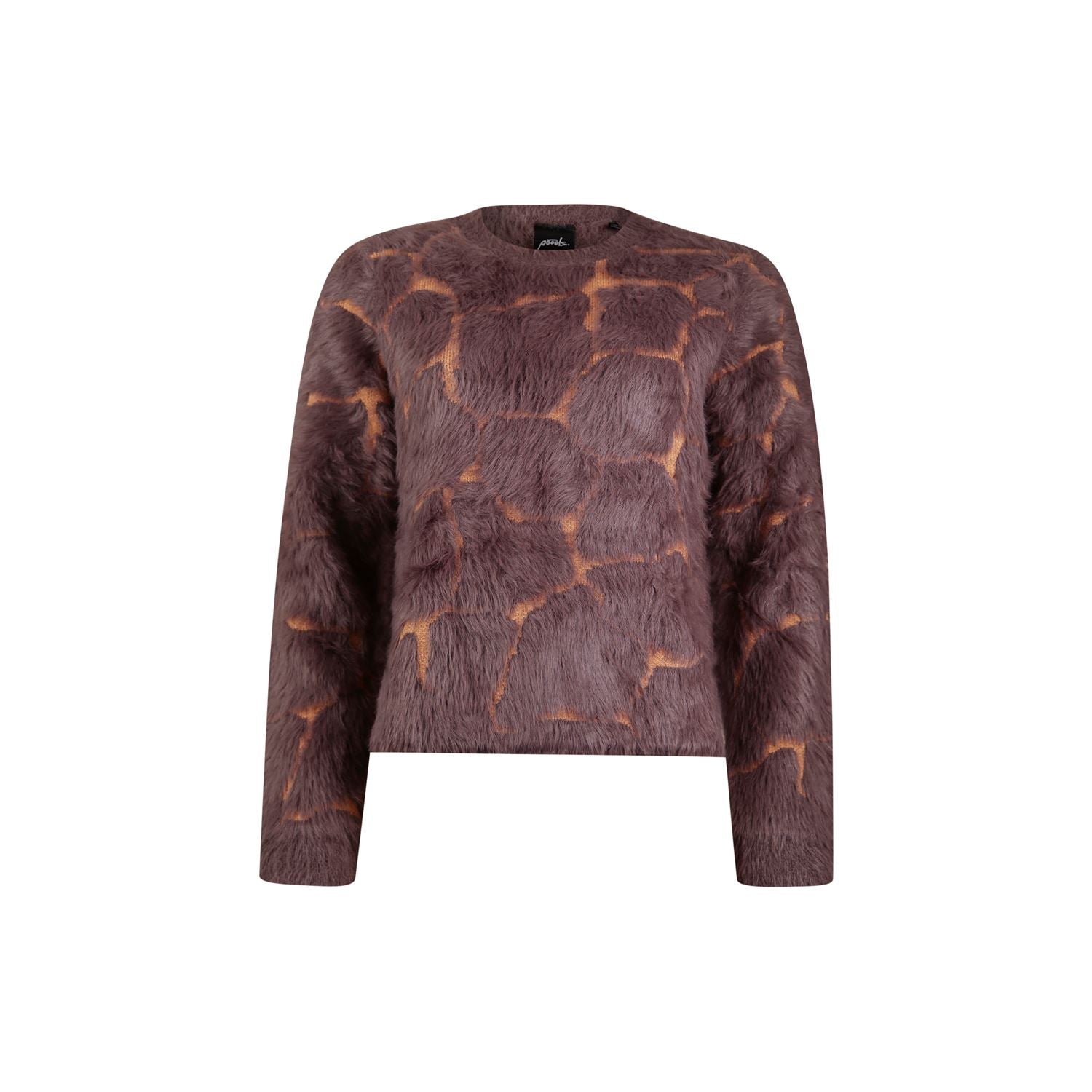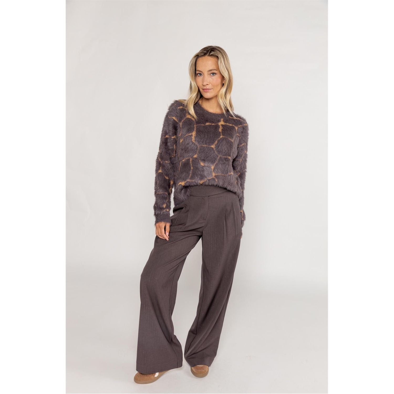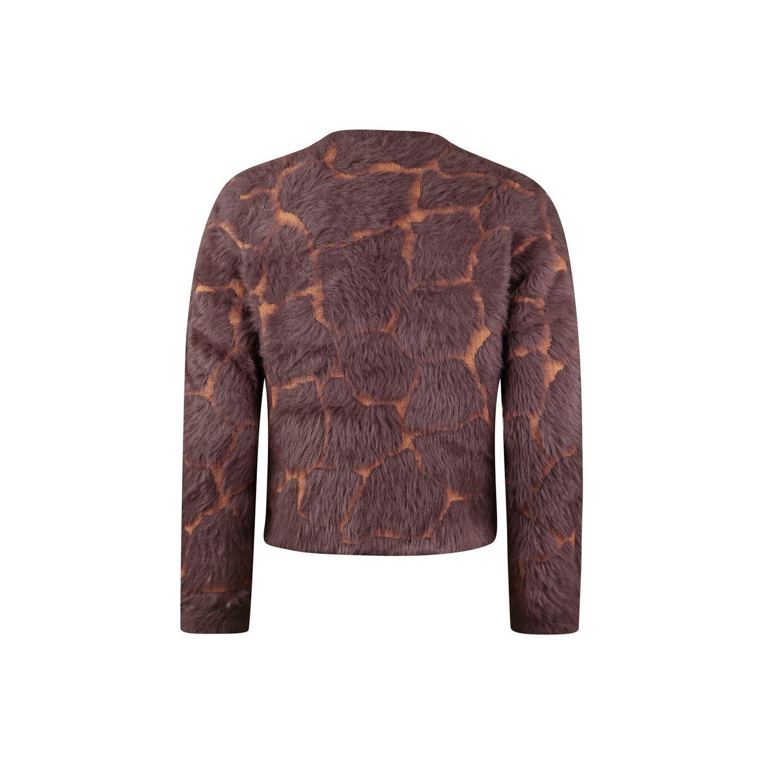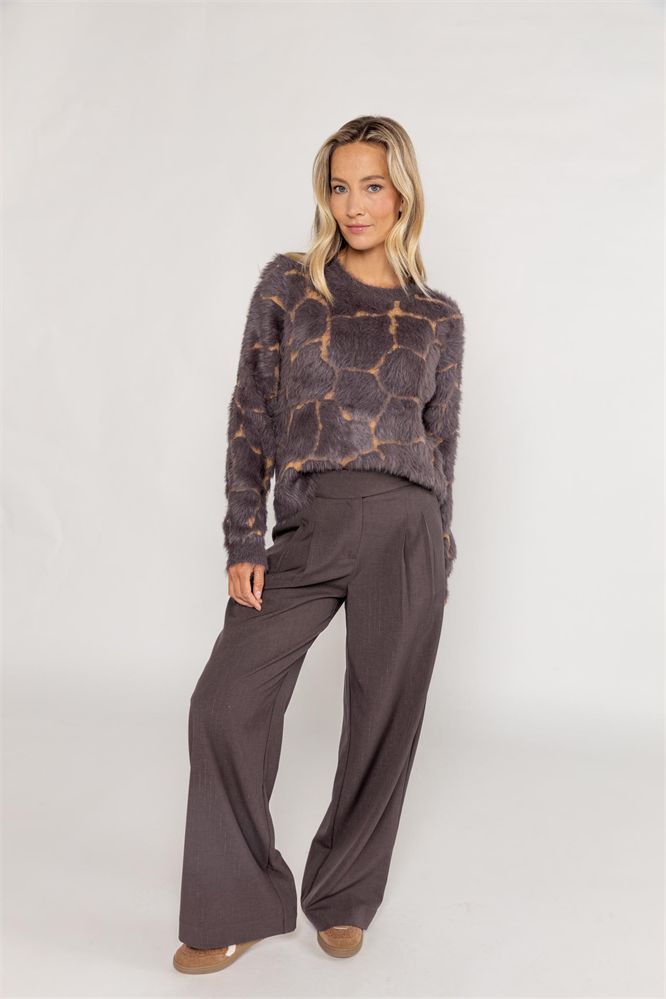 Jacquard gebreide trui met giraffe patroon, gemaakt van een mix van harig en glad garen. Voorzien van ronde hals en lange mouwen. Zacht en aaibaar is deze heerlijke trui.