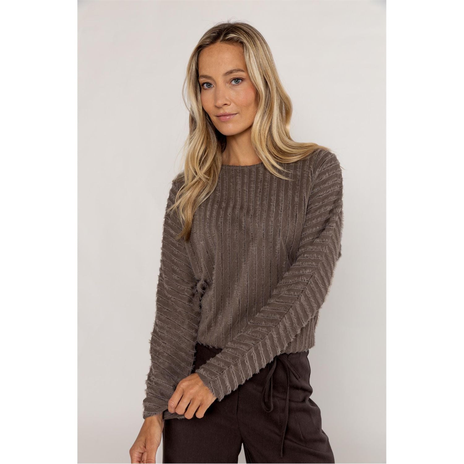 T-shirt met lange vleermuismouwen, en ronde hals. Gemaakt van zachte jersey met harig streeppatroon. Comfort en stijl in één – perfect voor een casual maar opvallende look.