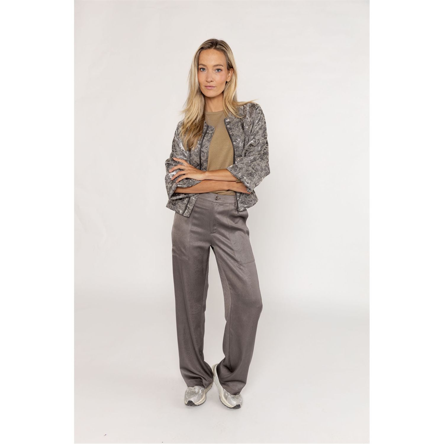Dit trendy bomber jasje heeft een cropped oversized model, ritsluiting en elastische boorden. Gemaakt van mat glanzende jacquard stof, straalt het een casual chique uitstraling uit. Perfect voor elke gelegenheid