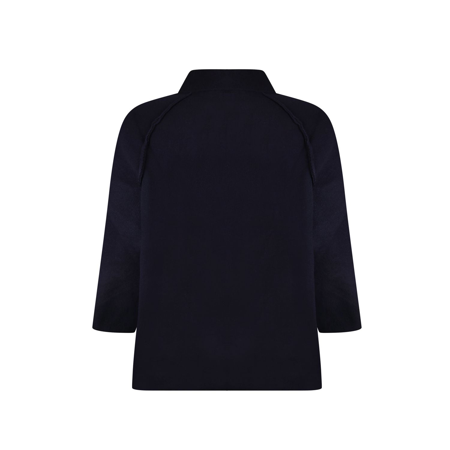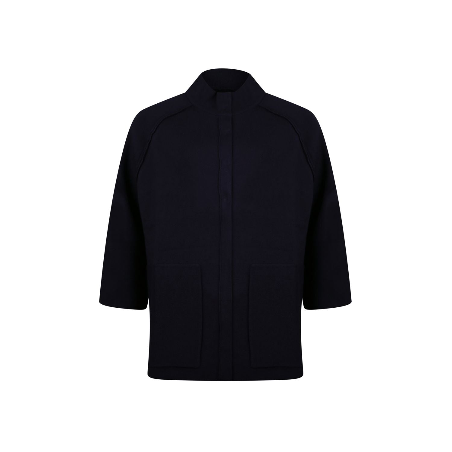 Halflang vest van viscosemix in milano steek. Wijde kimonomouw, opstaande kraag en drukknopen. Naar buiten gekeerde naden en opgestikte zakken geven een stoere, moderne look.