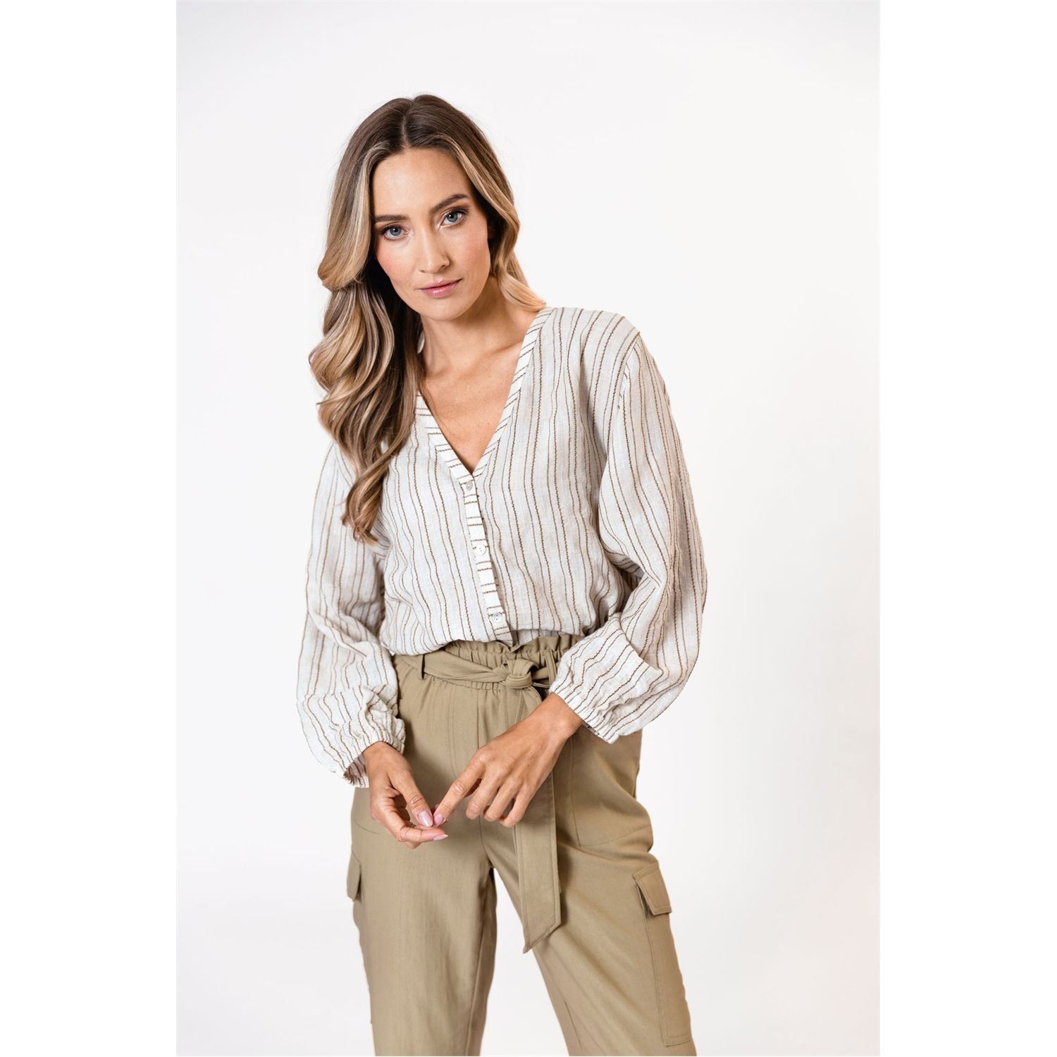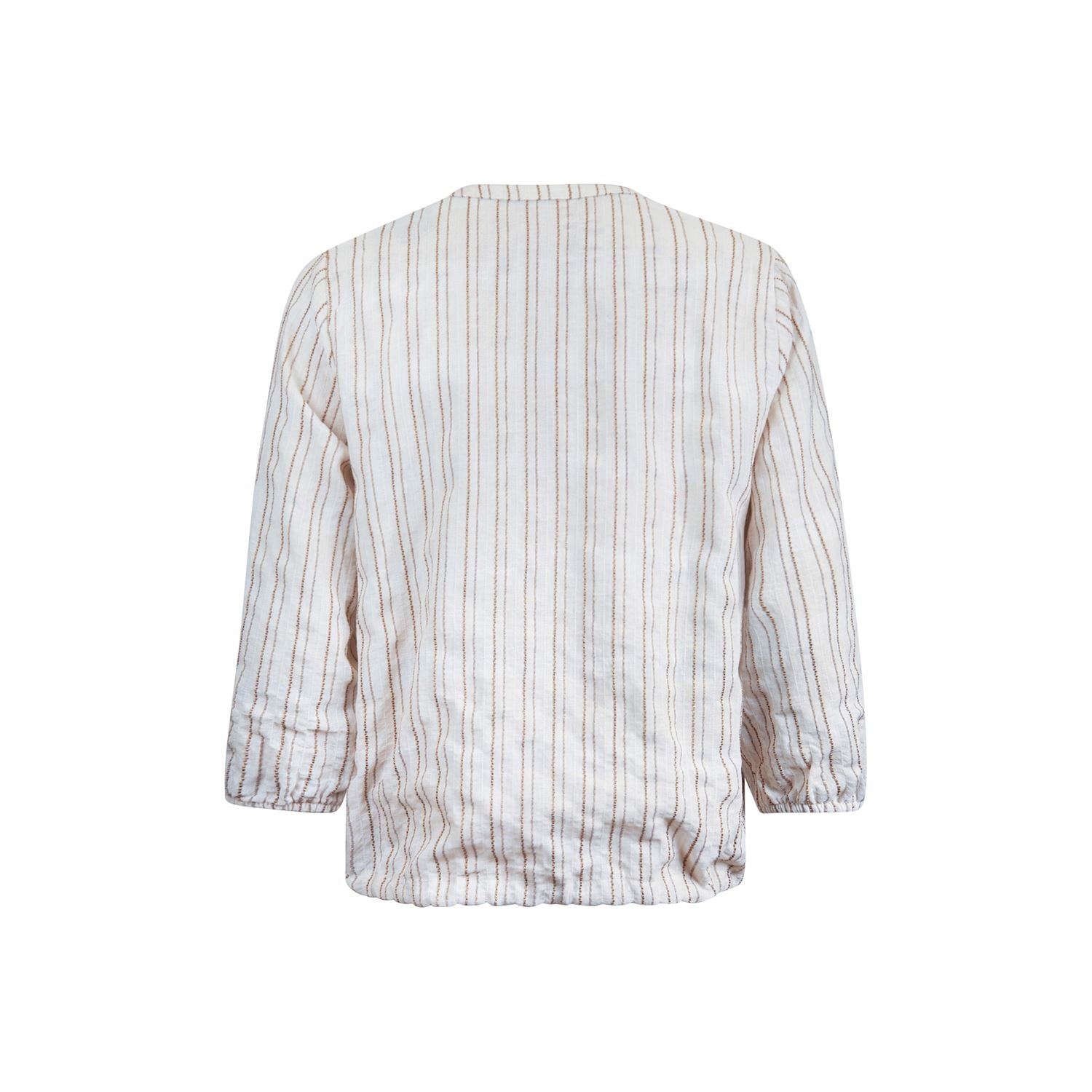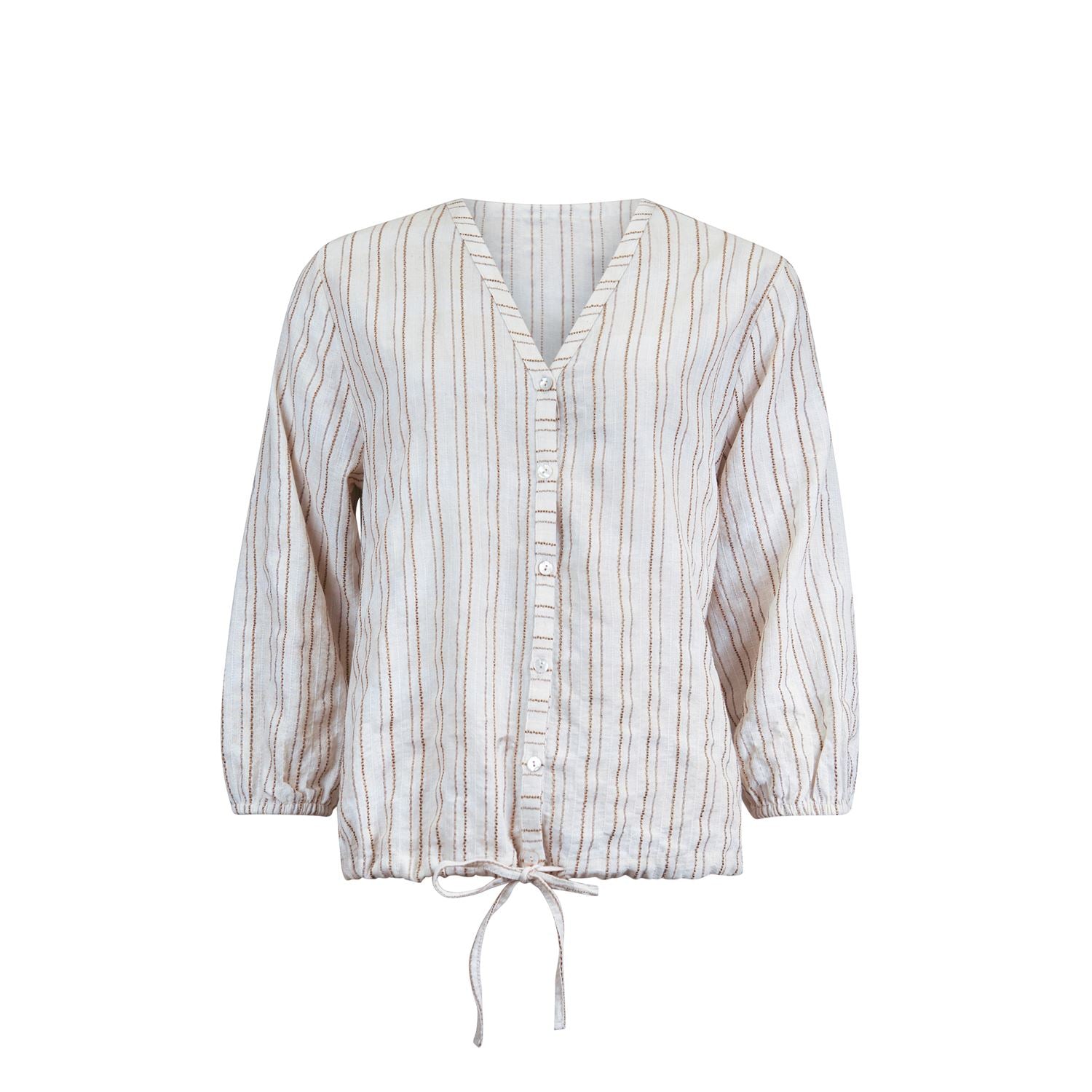 Deze gestreepte blouse in natuurlijke tinten heeft een V-halslijn en driekwart mouwen. De zoom is voorzien van een strikkoord waarmee je de blouse kunt aansnoeren voor een bloezende fit.