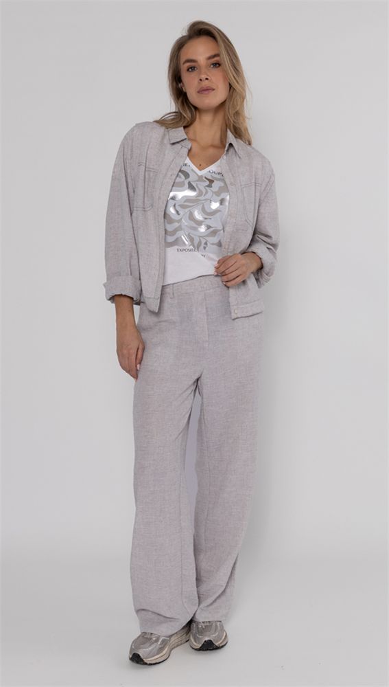 Blouse in gray blended fabric with contrast stitching, folded shoulder detail, collar and button closure. Pair with our matching pants for a total look.