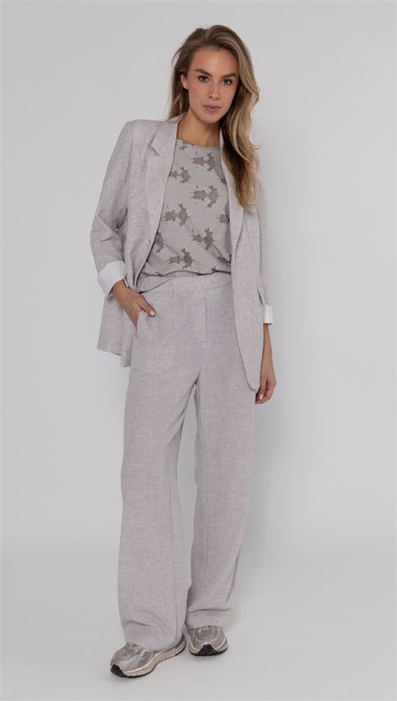 Grey blended pants with relaxed fit, straight leg, elastic waist and side pockets. Pair with our matching blazer for a total look.