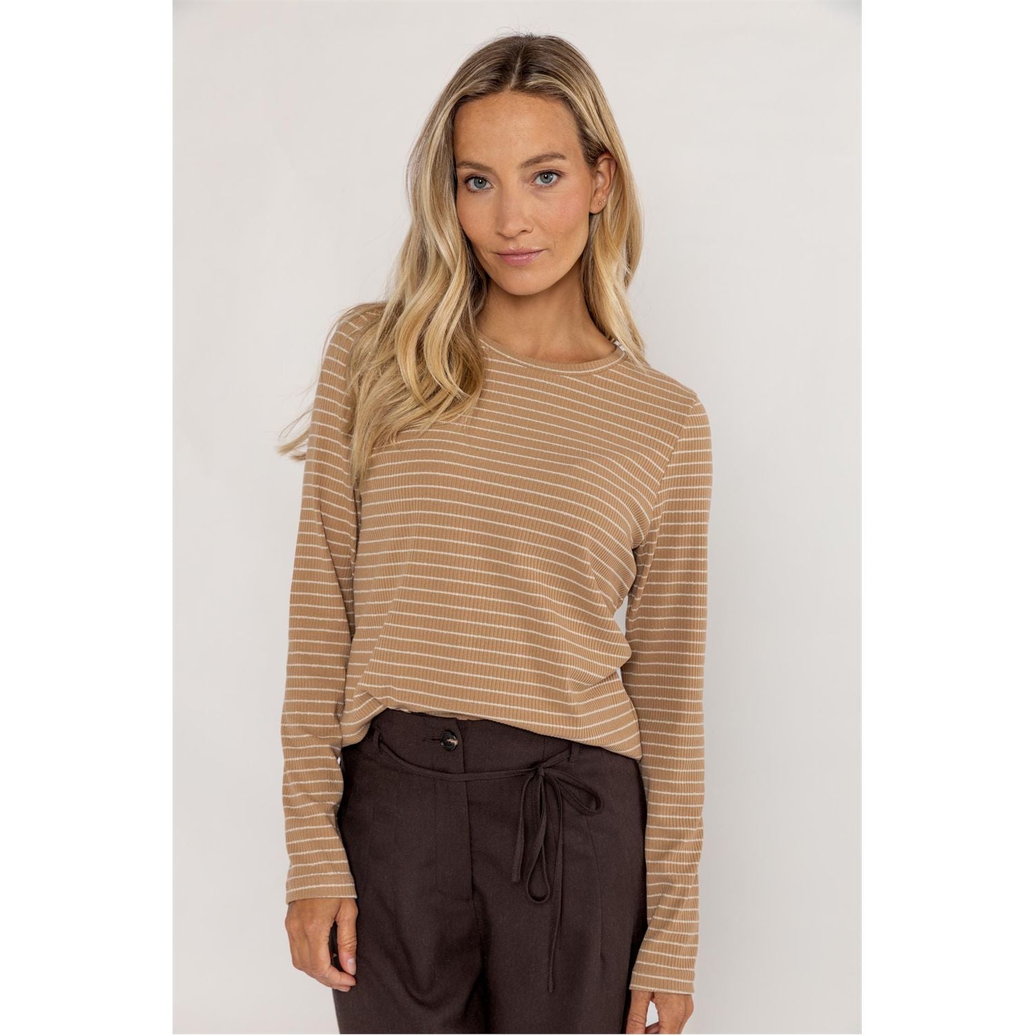 Basic jersey top with subtle lurex stripe. Features round neckline and long sleeves. Perfect to pair with one of our jackets or cardigans for an effortlessly stylish look.